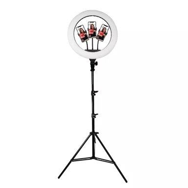 18″ LED right light features a tripod stand and 3 phone holders. Use for live streaming makeup tutorials video shoots and more. 320 LED ring light is dimmable for unflattering shadows. 5 Color lighting modes and 10 brightness levels. Tripod is retractable and easy to setup. Tripod extends from 26.4″ to 77.95″. 360-Degree rotatable phone holder. Phone holder moves horizontal vertical high angle low angle and more. Phone holder is spring loaded and extends up to 6.5″ wide. Includes: AC power cord. Remote control. 3x Phone mounts. Tripod.