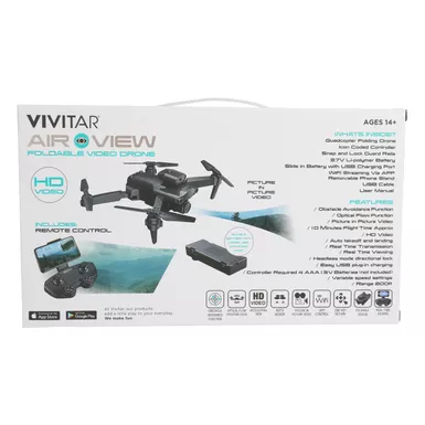 Gain picture and video from your drone flight with Air View. Obstacle avoidance function. Optical flow function. Picture in Picture video. 10 Minute approximate flight time. HD video with articulating view. Wifi app control and realtime transmission. Auto takeoff and landing. Headless mode directional lock. Recharge via USB plug-in. Variable speed settings. Range up to 200ft. Powered by 3.7V Li-polymer battery. Includes: Icon coded controller. Snap and Lock guard rails. Slide in battery with USB charging port. Removable phone stand. USB cable.